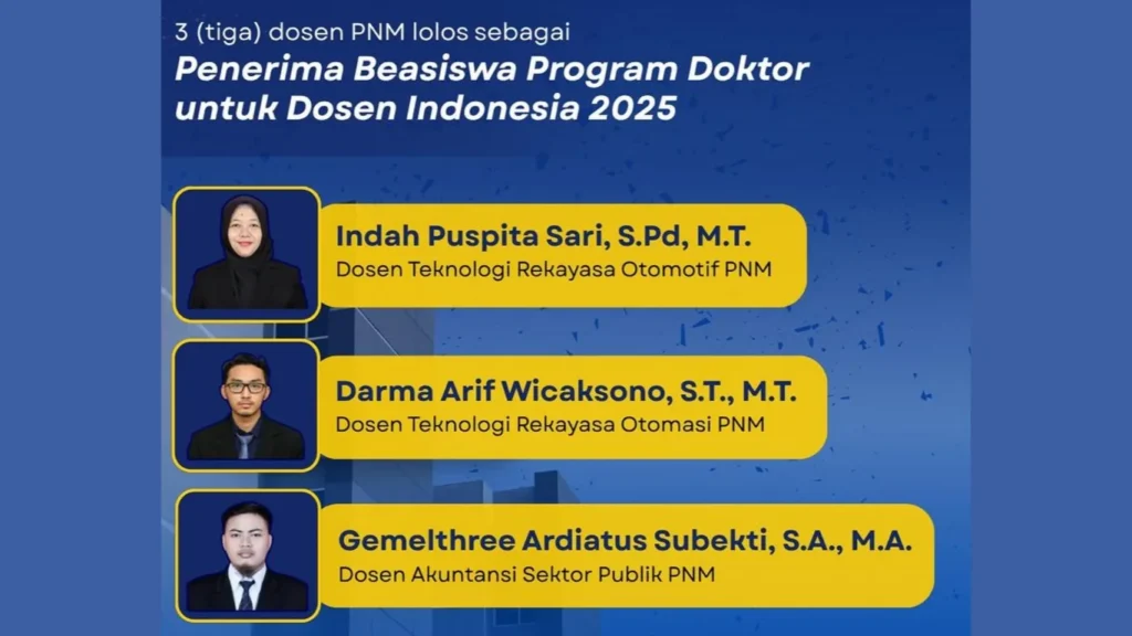 PNM – Politeknik Negeri Madiun (PNM) terus mencetak prestasi. Kali ini sejumlah tiga dosen dari berbagai program studi telah lolos sebagai penerima Beasiswa Program Doktor untuk Dosen Indonesia (Beasiswa PDDI) 2025.